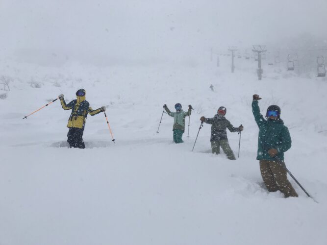 また、ハイシーズンによくあるパターンとして、バックカントリーのツアーが予定されていた日に、大雪が降ると、ツアーを中止にし、ゲレンデセッションにプラン変更し希望者のみでゲレンデでセッションを行う日もあります。コンデション次第ではあなたが1人でゲレンデを滑るよりも、BCに行くよりもたくさんのパウダーランが可能なので、これは毎年大好評をいただいていています。